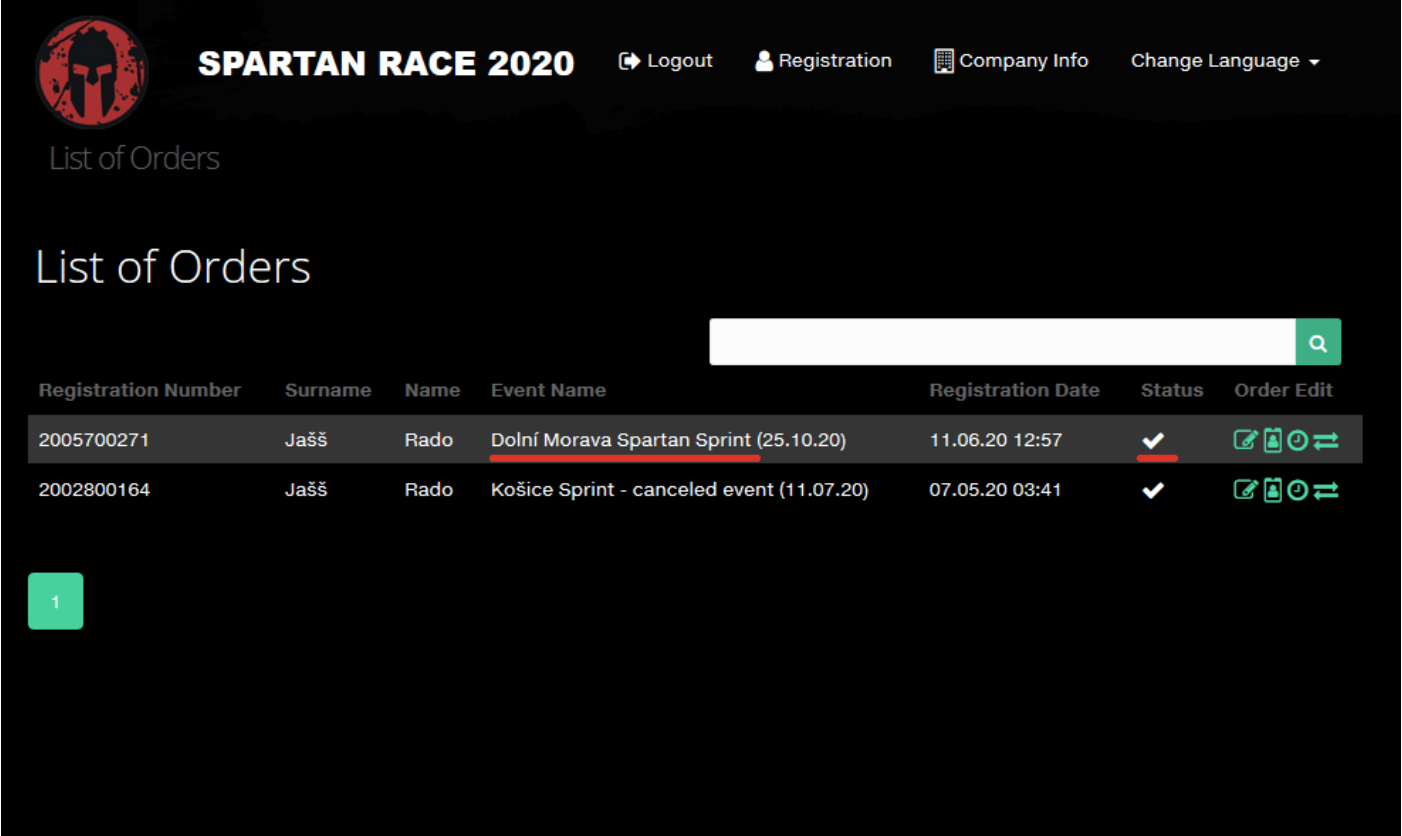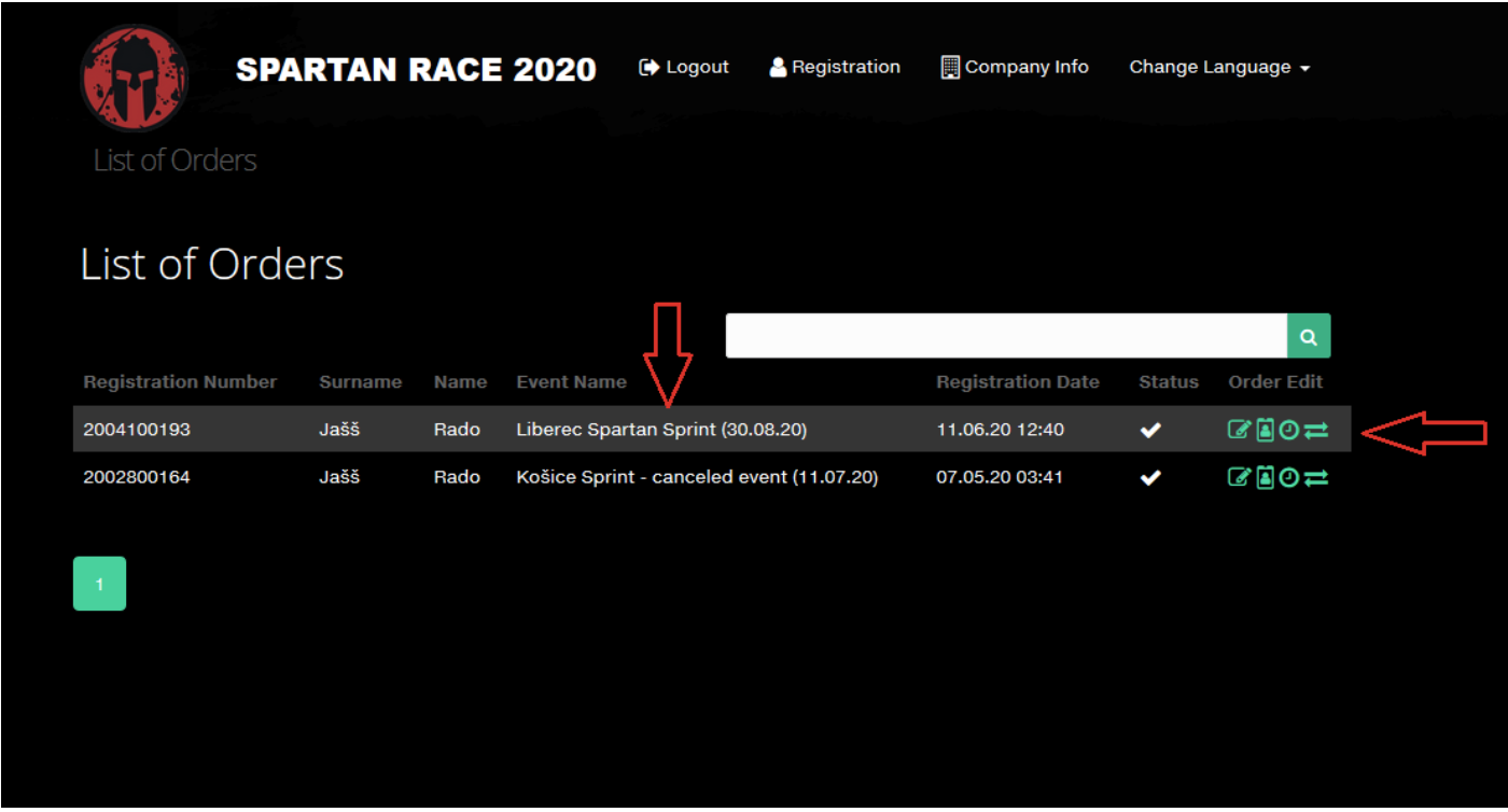 Click on „Registration“ in the top menu and you will see a list of your registrations (marked „List of orders“). Let‘s say you want to change your Sprint Liberec registration to a Sprint in Dolní Morava in Czech republic.