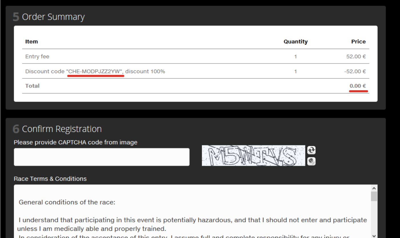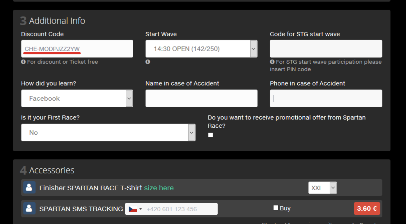 Copy the „Code of race change“ which you received via email (in yellow frame in the picture above) and continue to register to the new race with this code. It will let you register for free. You have to use the same profile and same personal data to make the new registration, otherwise the code will not work.