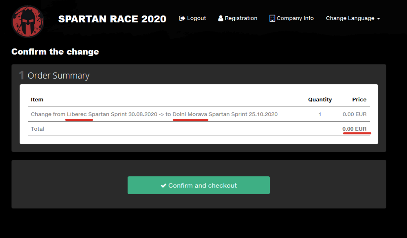 After you click on the confirmation button a confirmation message will be displayed and you will also receive a confirmation email about your change of the race in your email inbox. If you’ve chosen a race in a higher category (e.g. you had a registration for Sprint and you’ve chosen Beast) the system will automatically require a payment. This fee is including the price difference between categories and processing fee.
